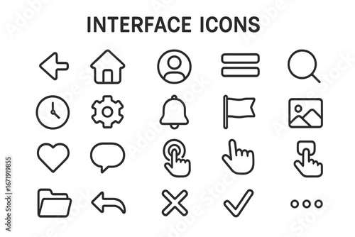 Interface UI outline icon set with user interaction and navigation symbols, minimalistic vector cartoon illustration on transparent background, ordered set 3 for digital design