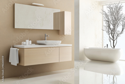 interior, Contemporary Bathroom Design Featuring Light Wood Cabinets and Warm Natural Tones