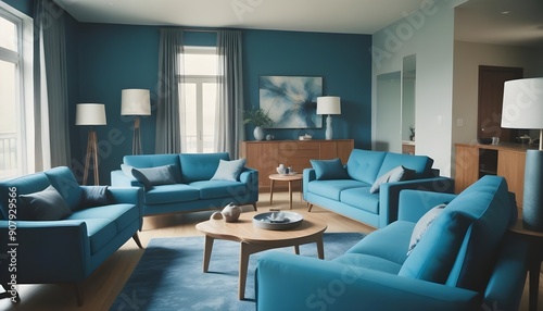 Interior design of a modern living room with blue sofas and a gray armchair