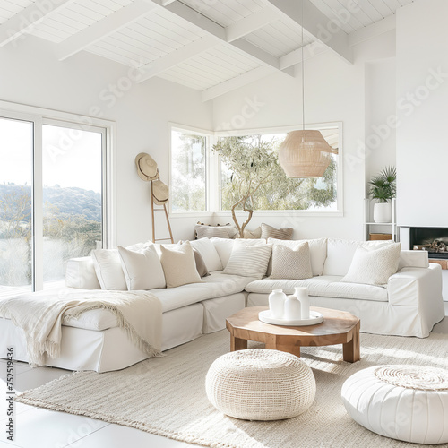 Interior design of modern apartment with bright sofa, table home plants and decoration. Interior mockup. Scandinavian interior design. Generative AI