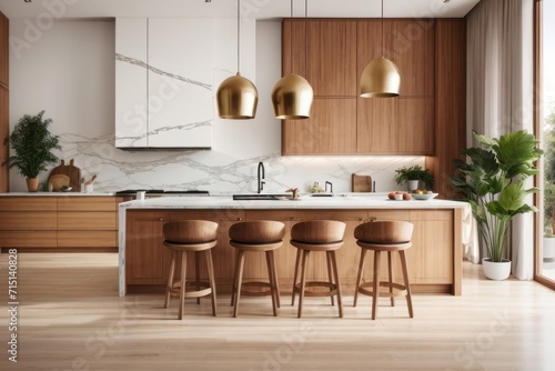 Interior home design of modern kitchen with wooden table and chairs in the farmhouse kitchen