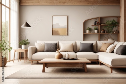 Interior home design of modern living room with beige sofa and wooden table with wooden furniture and houseplants near the window