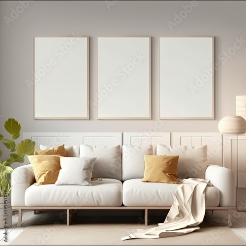 Interior living room wall mockup with light grey, brown and wood sofa and decor on white background.