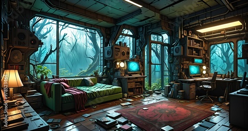 interior of bedroom in futuristic fantasy house. wood cabin room on spring woodland morning. forest home with trees and vines.