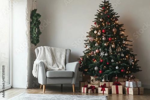 Interior of festive living room with grey armchair and gift boxes under Christmas tree