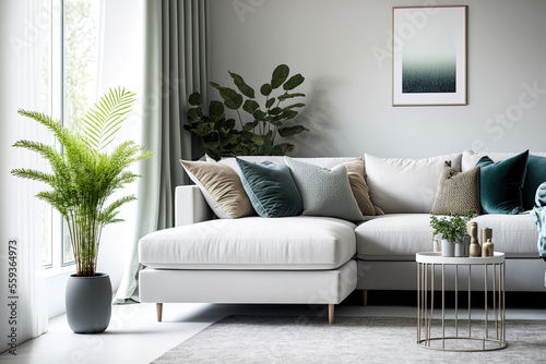 Interior of living room with plush carpet and chic furnishings. Generative AI