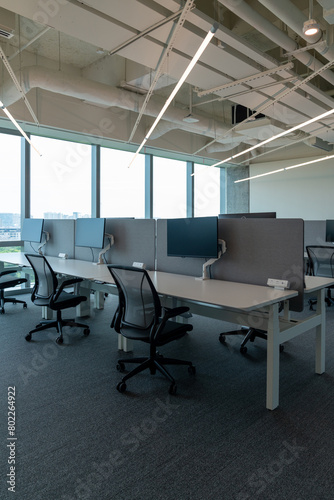 Interior of modern empty office building.Open ceiling design.Equipped with automatic lifting table and LCD screen.