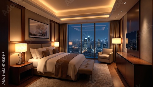 Interior of modern hotel room at night with city skyline view. Bedroom decor includes lamps, bed with pillows, armchair, TV. Luxury apartment design with big windows and city lights.