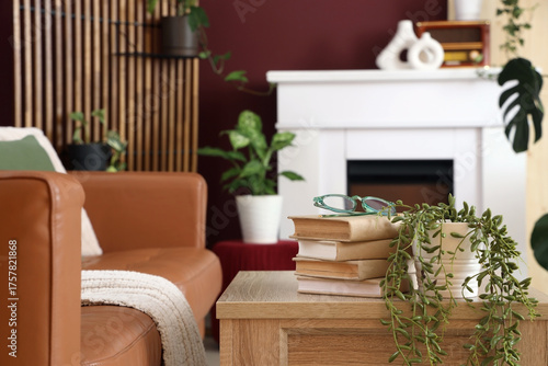 Interior of stylish living room with cozy brown sofa, wooden coffee table and fireplace