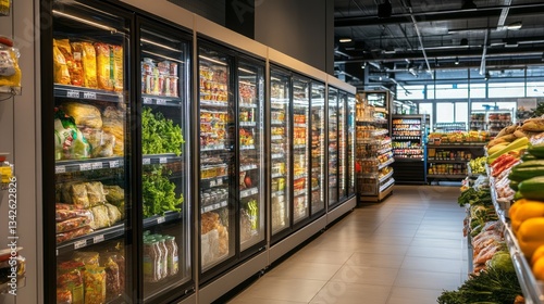 interior shot of a modern grocery store with a wide variety of food products in refrigerators.