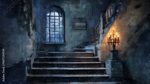 interior view of a Victorian Haunted House Staircase by the Moon — Candlelit Gothic Hall