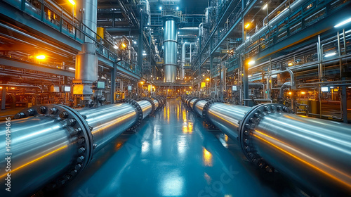 Interior view of an oil refinery plant with large stainless steel pipelines and machinery, illuminated brightly, conveying efficiency and industrial advancement