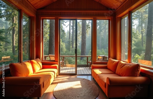 Interior view of modern sunroom with orange sofas and large windows overlooking pine forest. Natural light streams in, creating cozy ambiance for relaxation and retreat.