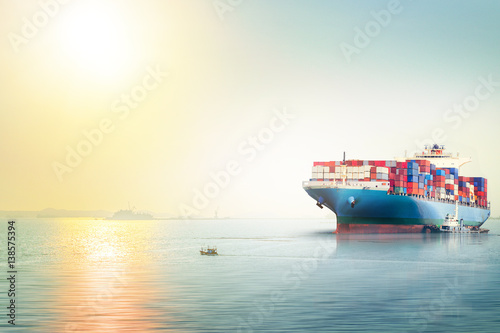 International Container Cargo ship in the ocean at sunset sky, Freight Transportation, Nautical Vessel