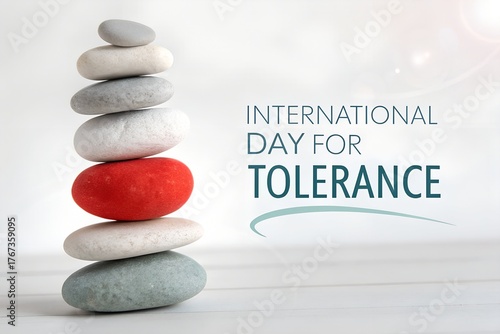 International Day for Tolerance concept with a stack of zen stones. The single red rock symbolizes diversity, acceptance, and inclusion within a harmonious society. Generative Ai.