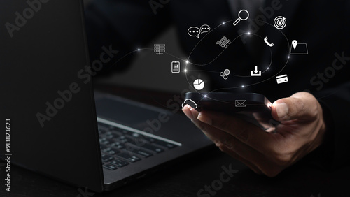 Internet of Things and Digital marketing concept. Businessman working with mobile phone with VR icon diagram.