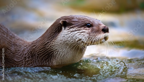 Intimate Encounter with the Majestic European River Otter A Striking CloseUp Portrait Amidst a Steamy Stream, Capturing the Elegance and Vigilance of Natures Agile Swimmer.