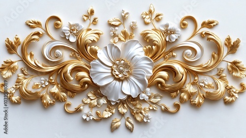 Intricate 3D golden Baroque ornament featuring swirling floral designs leaf filigree and opulent rococo scrolls set on a white background for an elegant luxurious look