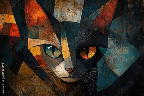 Intricate Abstract Representation of a Cat in Geometric Style with Vivid and Colorful Patterns Embodying Artistic Expression and Creativity through Unique Design Techniques in Contemporary Art