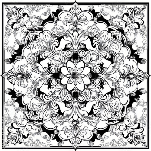Intricate Black and White Floral Mandala Design with Symmetric Patterns and Detailed Ornamental Elements