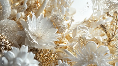 Intricate floral sculpture in a soft white and gold palette, featuring radiant metallic textures and elegant botanical forms.