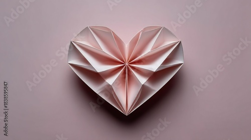Intricate origami heart crafted from pink paper, showcasing detailed folds and textures, symbolizing love and creativity in a minimalist design with soft background