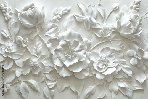 Intricate white floral relief design on a textured background.