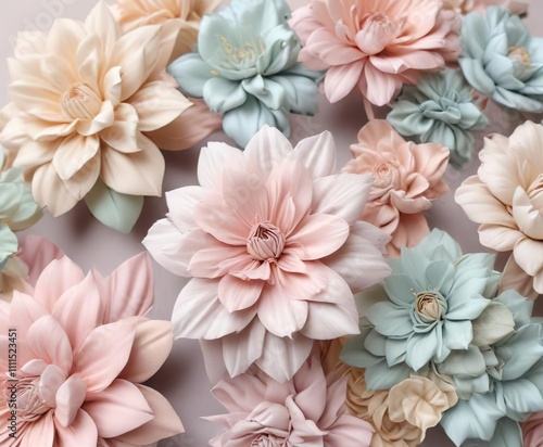 intricately folded and tied fabric flowers in shades of pastel colors, soft hues, paperless flowers, natural dye