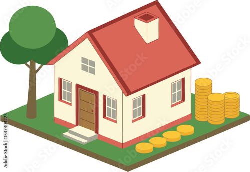 Investing in Real Estate Illustrated by Isometric House, Stacked Coins, and Tree Representing Growth and Financial Security
