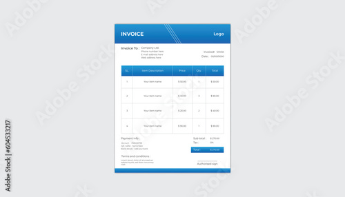 Invoice minimal corporate business design template . Vector illustration .