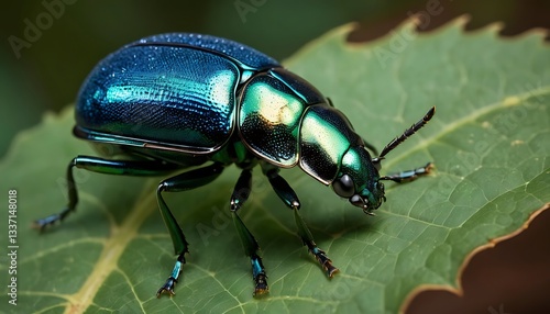 Iridescent Beetle Resting on Green Leaf Macro Close Up