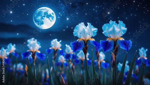 Irises Blooming Under Moonlight Starry Night Garden Scene