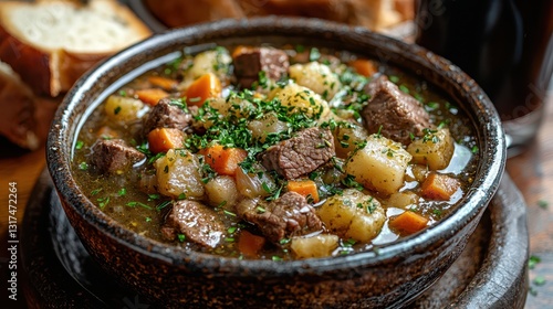 Irish beef stew concept. A hearty bowl of stew with meat, potatoes, and carrots, garnished with herbs, served alongside bread.