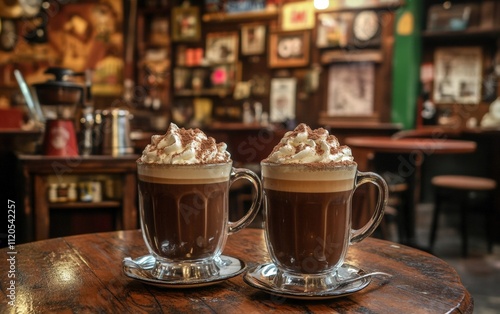 Irish coffee topped with whipped cream and grated chocolate. Rustic pub backdrop with wooden tables and vintage dÃ?cor