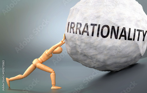Irrationality and painful human condition, pictured as a wooden human figure pushing heavy weight to show how hard it can be to deal with Irrationality in human life, 3d illustration