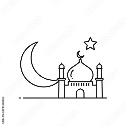 Islamic mosque with crescent moon and star, minimalist line art icon