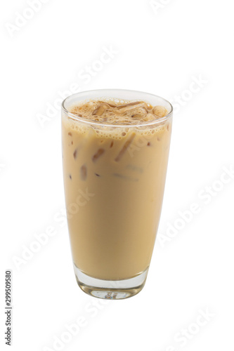 Isolate long tall glass beverage on white background with clipping path. Dicuted of freshness Iced coffee Latte.