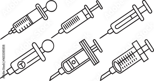 Isolated black syringe icons, medical injection, vaccination needle, healthcare syringe, editable vector for immunization, hospital use, medicine and treatment graphics