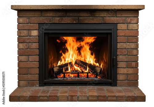 Isolated Brick Fireplace with Burning Logs and Mesh Screen