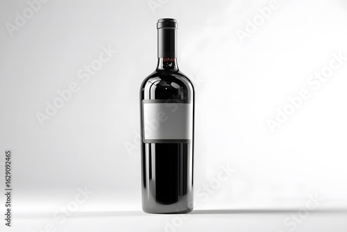 Isolated dark glass wine bottle with blank white label on a plain white background in studio lighting