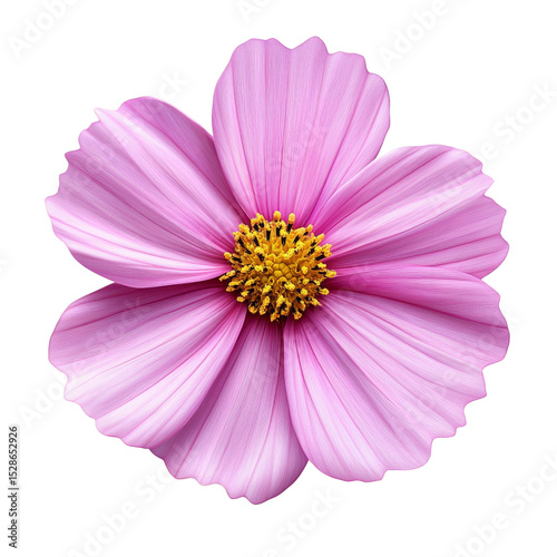 Isolated Detailed pink cosmos flower with bright yellow pollen center close up