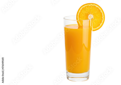Isolated glass of orange juice with a slice of fresh fruit on the rim, tasty drink