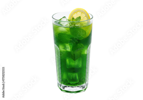 Isolated green cocktail, mint leaves, ice cubes, and lemon slice in glass, close-up