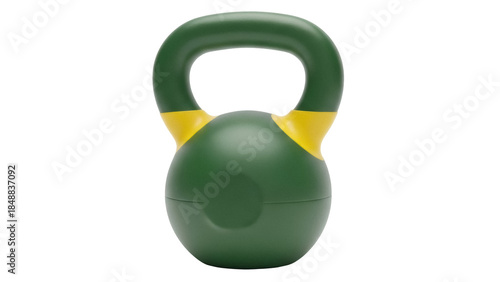 Isolated green kettlebell with yellow accents stands ready for fitness or weight training use