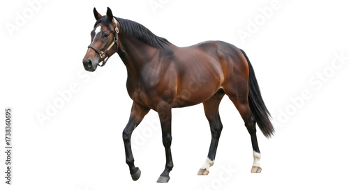 Isolated horse standing, a brown equine animal with a bridle and a black mane and tail