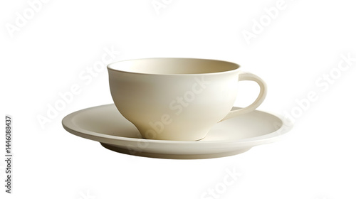 Isolated image of a cream colored teacup with a handle sitting on a matching saucer on transparent background