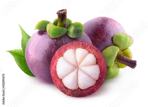 Isolated mangosteens. Two whole fruits and one half isolated on white background with clipping path