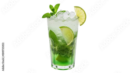 Isolated mojito cocktail with mint sprigs, ice cubes and lime slice garnish for bar or restaurant