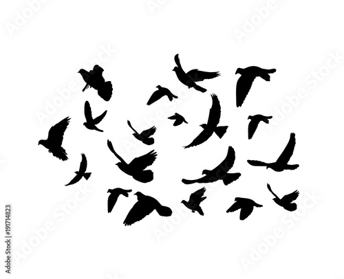 isolated, silhouette flying birds on white background