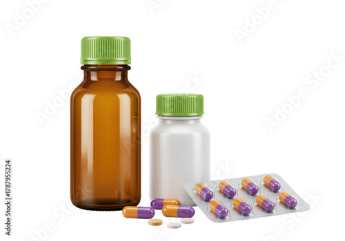 Isolated still life showing medicines and pills and bottles against neutral background